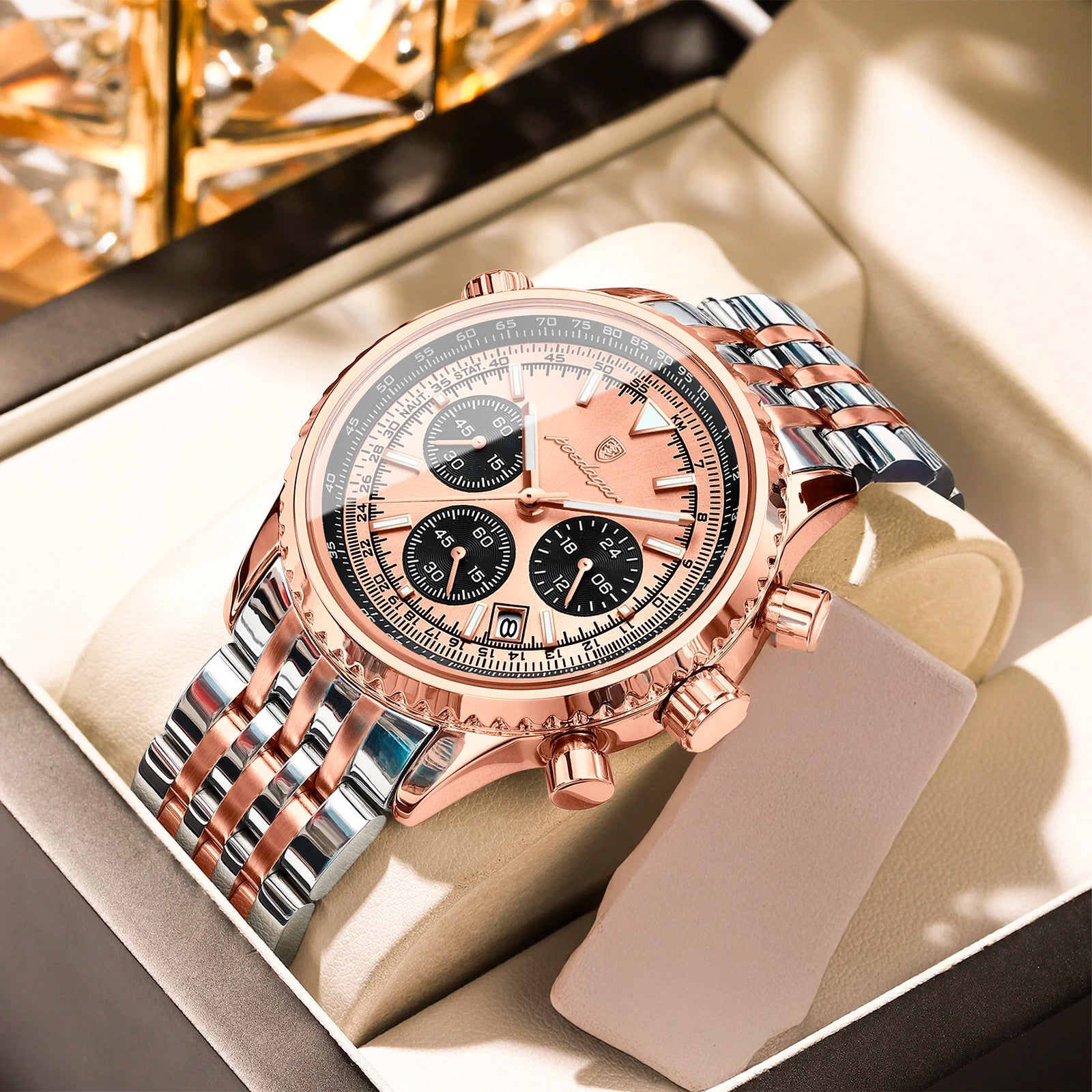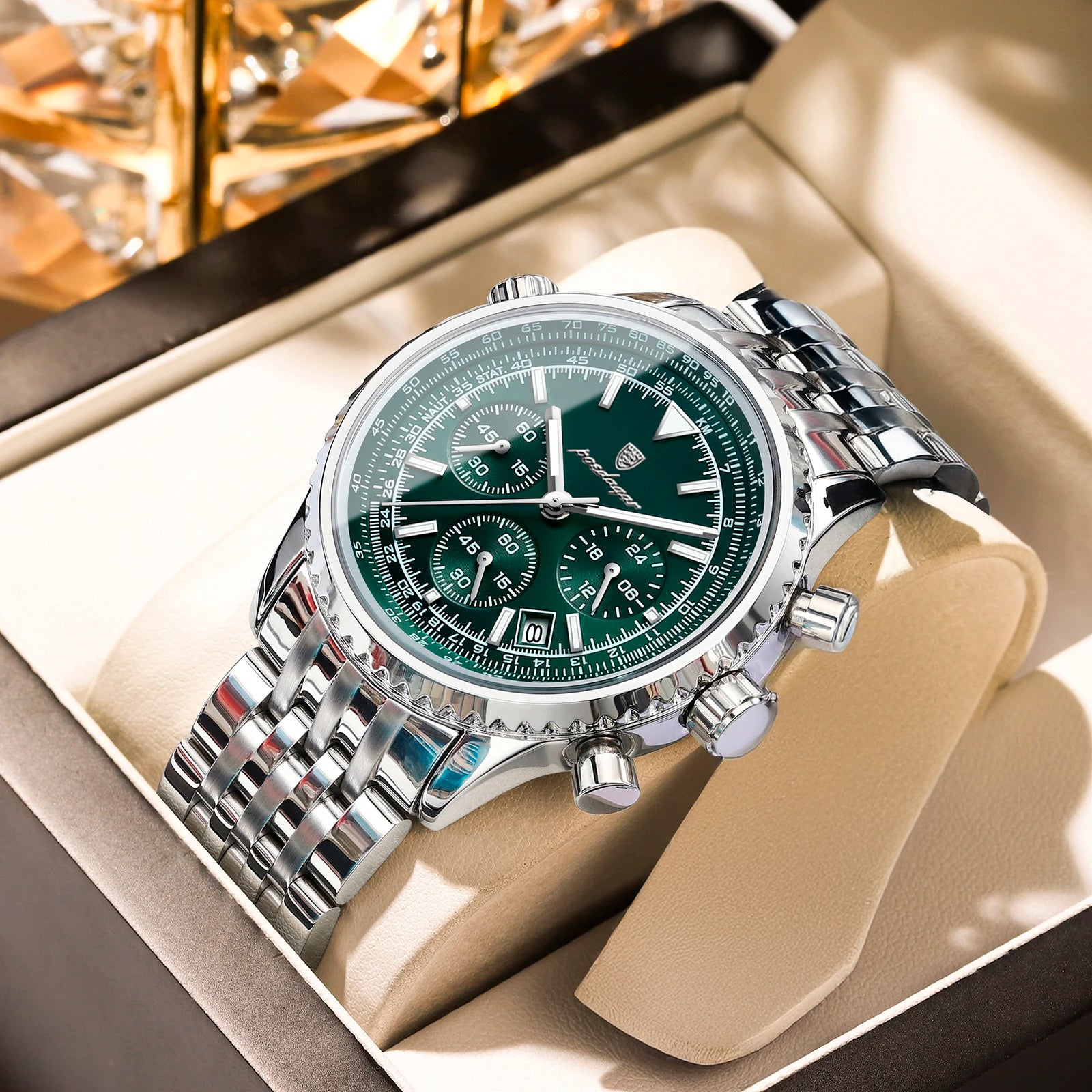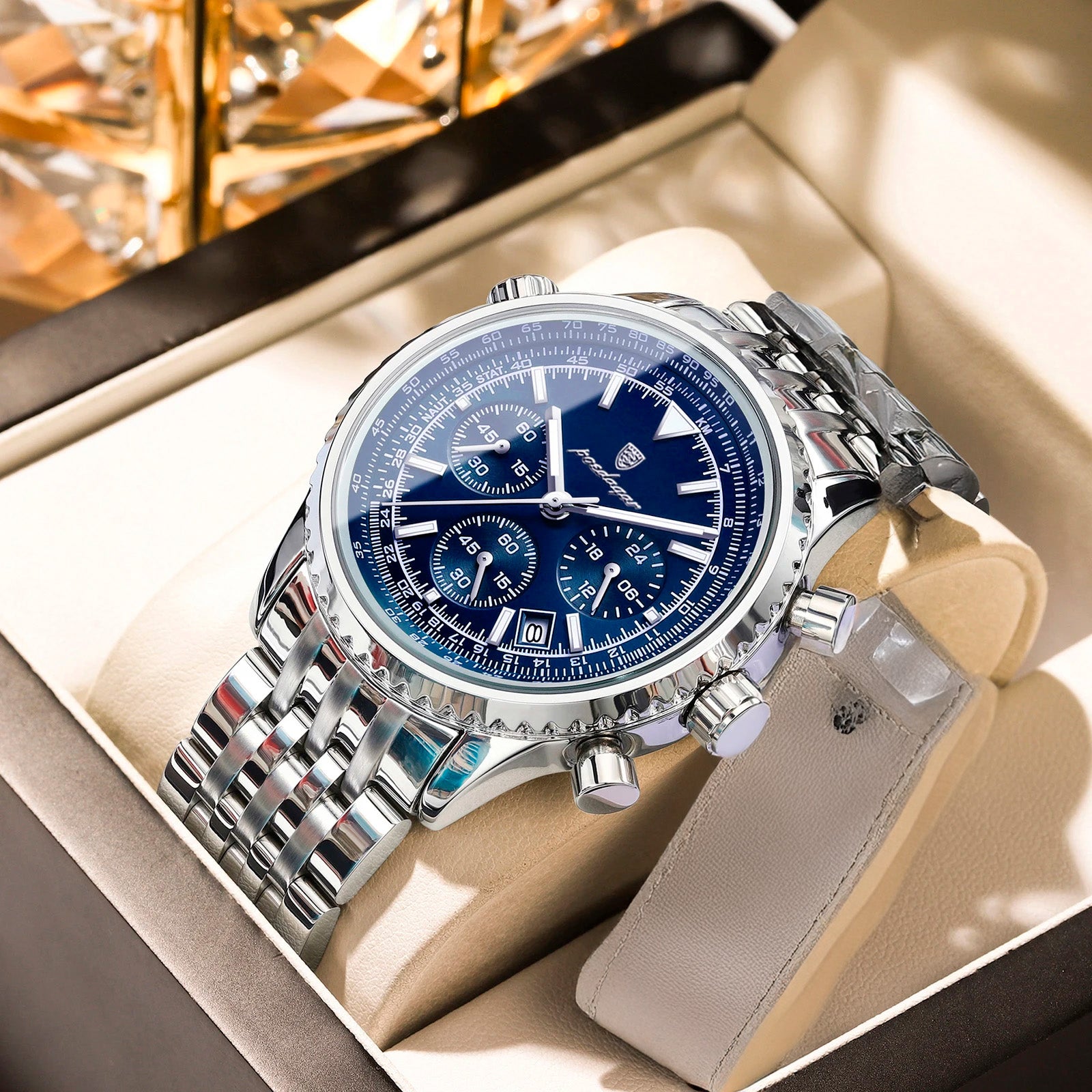 O relógio cronógrafo de luxo é o acessório perfeito para elevar qualquer visual. Com a sua elegante bracelete de couro e design sofisticado de cronógrafo, este relógio não se destaca apenas pela aparência – também oferece desempenho. O mostrador luminescente permite ler a hora facilmente em ambientes com pouca luz, enquanto o movimento de quartzo de precisão garante que esteja sempre a horas, onde quer que a vida o leve.