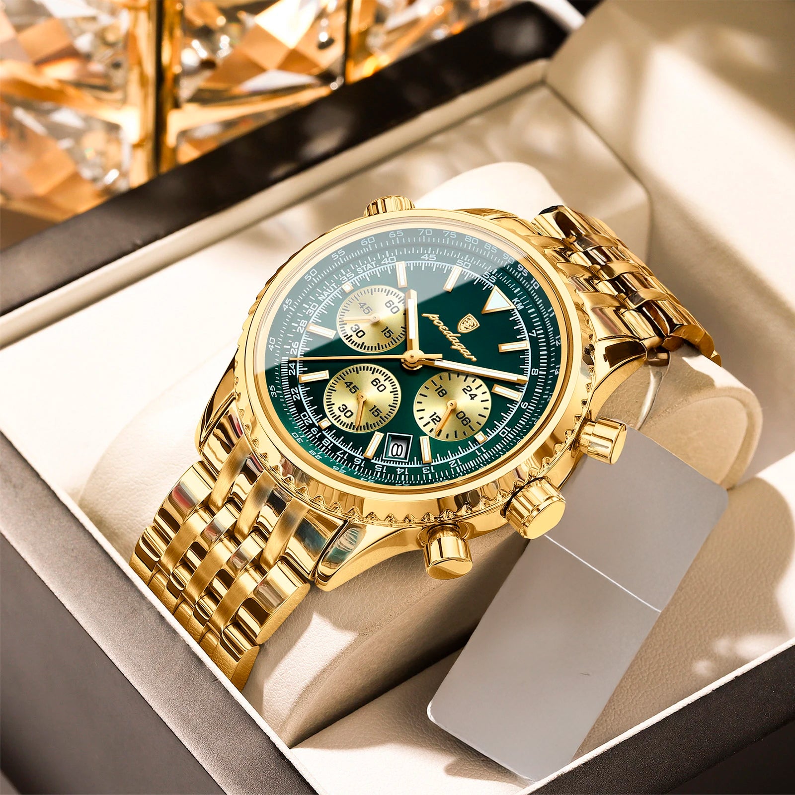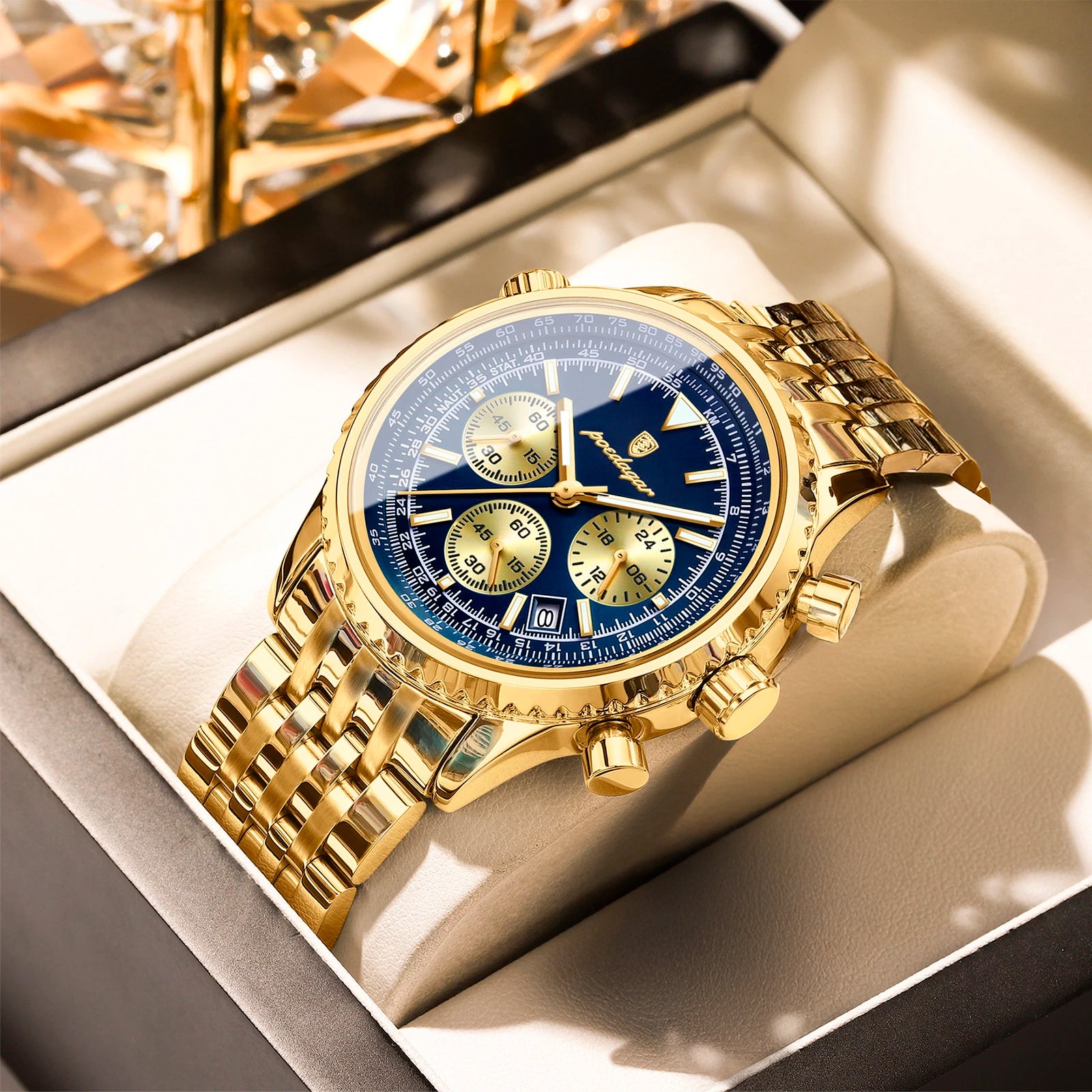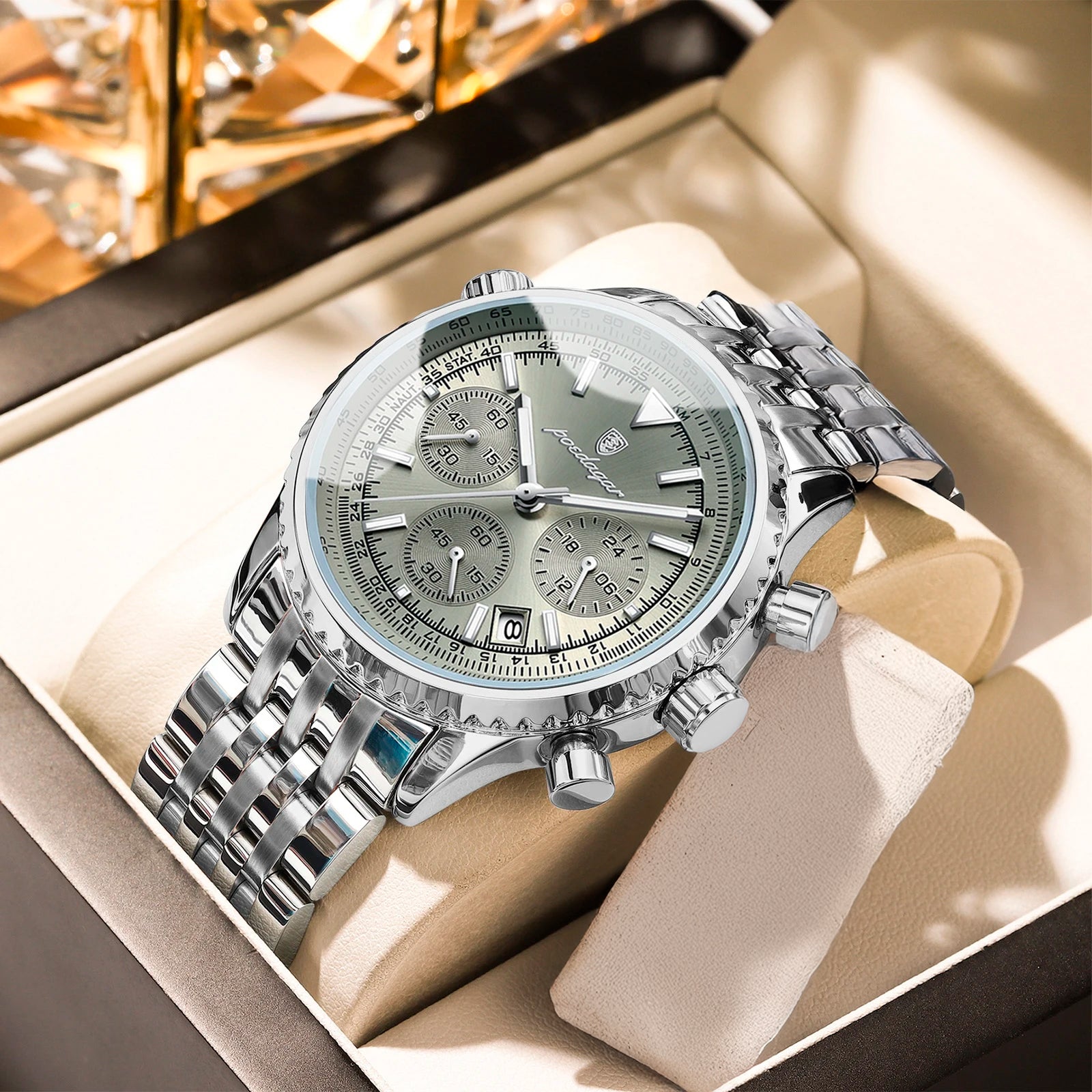 O relógio cronógrafo de luxo é o acessório perfeito para elevar qualquer visual. Com a sua elegante bracelete de couro e design sofisticado de cronógrafo, este relógio não se destaca apenas pela aparência – também oferece desempenho. O mostrador luminescente permite ler a hora facilmente em ambientes com pouca luz, enquanto o movimento de quartzo de precisão garante que esteja sempre a horas, onde quer que a vida o leve.