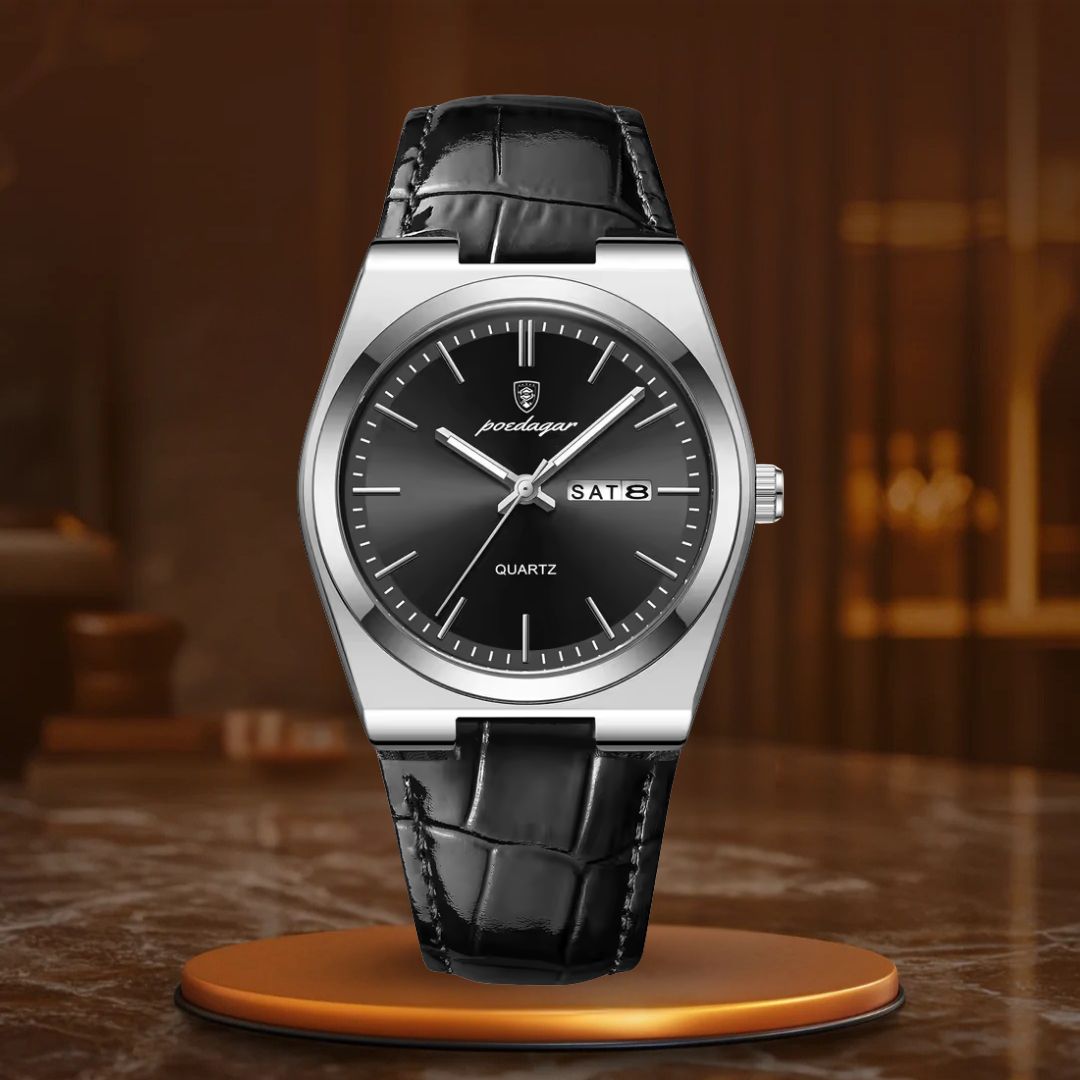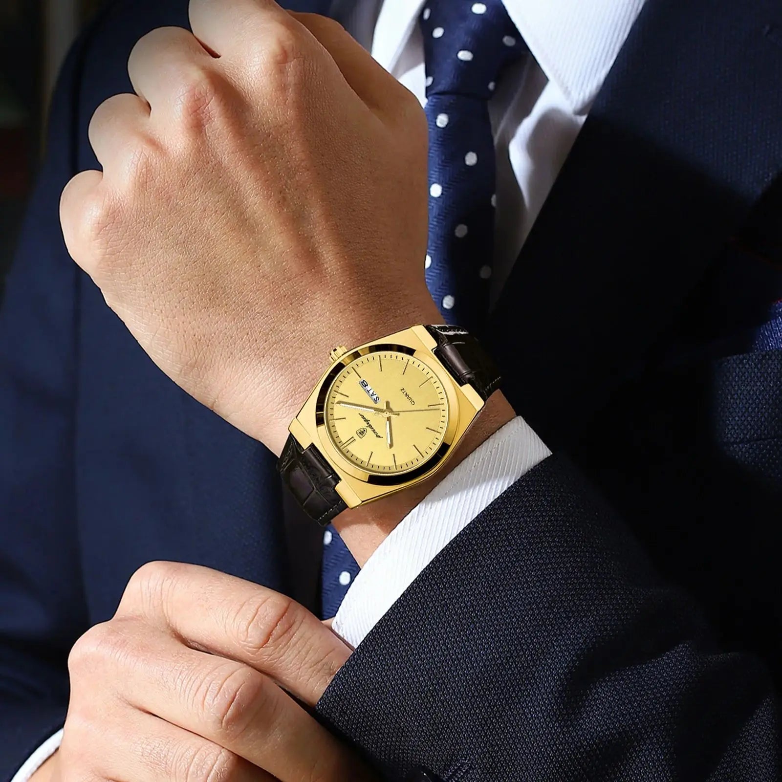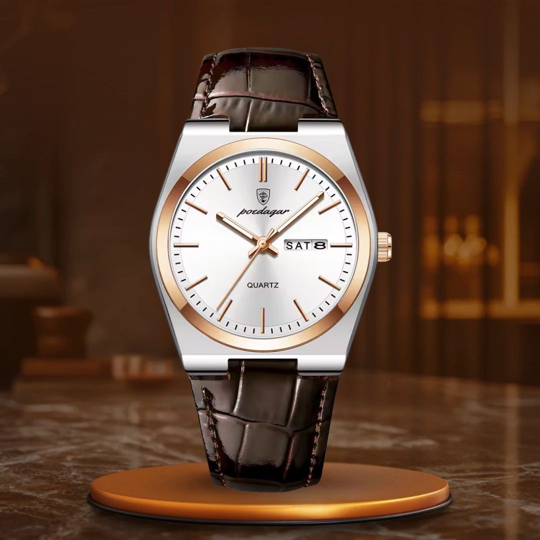 Faça uma declaração de sofisticação e confiança com o relógio de negócios de luxo com bracelete de couro. O design resistente à água garante fiabilidade independentemente do clima, enquanto o mostrador de data acrescenta valor prático ao visual elegante e estiloso. A combinação do couro clássico com a funcionalidade moderna torna este relógio a escolha ideal para o homem que deseja luxo e utilidade. É mais do que um relógio – é um reflexo do seu gosto impecável e dedicação à qualidade.