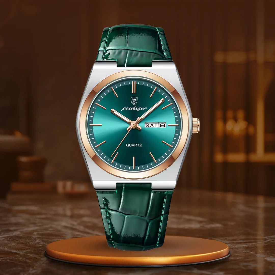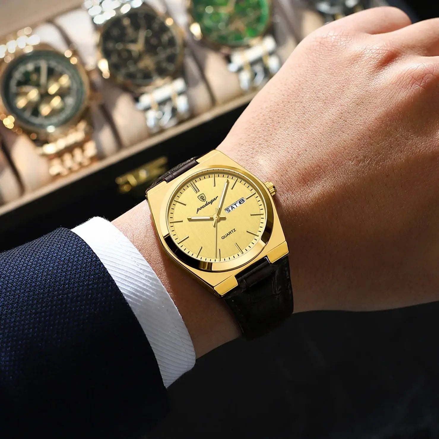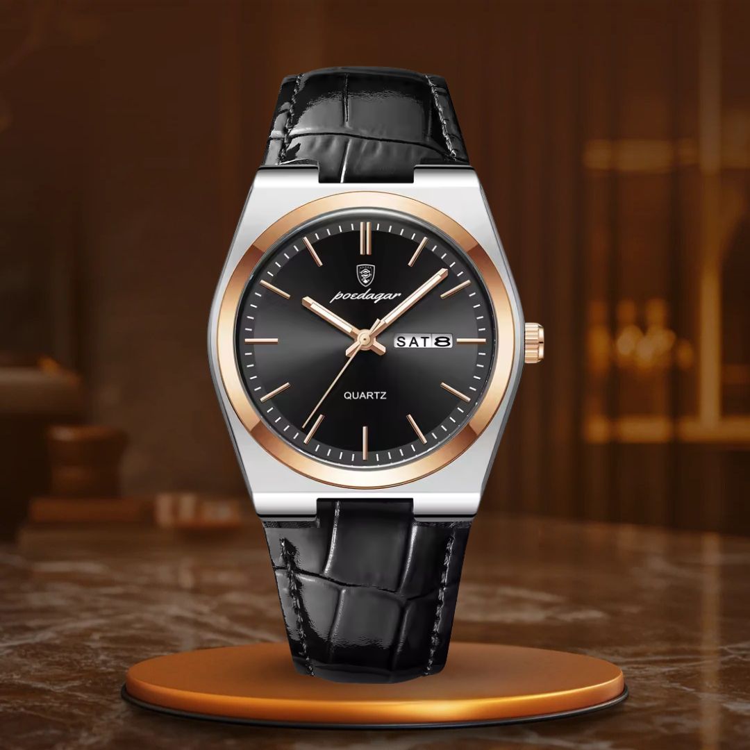 Faça uma declaração de sofisticação e confiança com o relógio de negócios de luxo com bracelete de couro. O design resistente à água garante fiabilidade independentemente do clima, enquanto o mostrador de data acrescenta valor prático ao visual elegante e estiloso. A combinação do couro clássico com a funcionalidade moderna torna este relógio a escolha ideal para o homem que deseja luxo e utilidade. É mais do que um relógio – é um reflexo do seu gosto impecável e dedicação à qualidade.